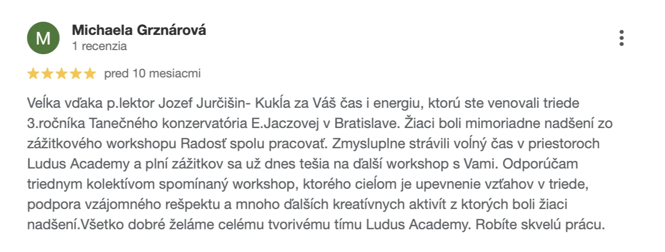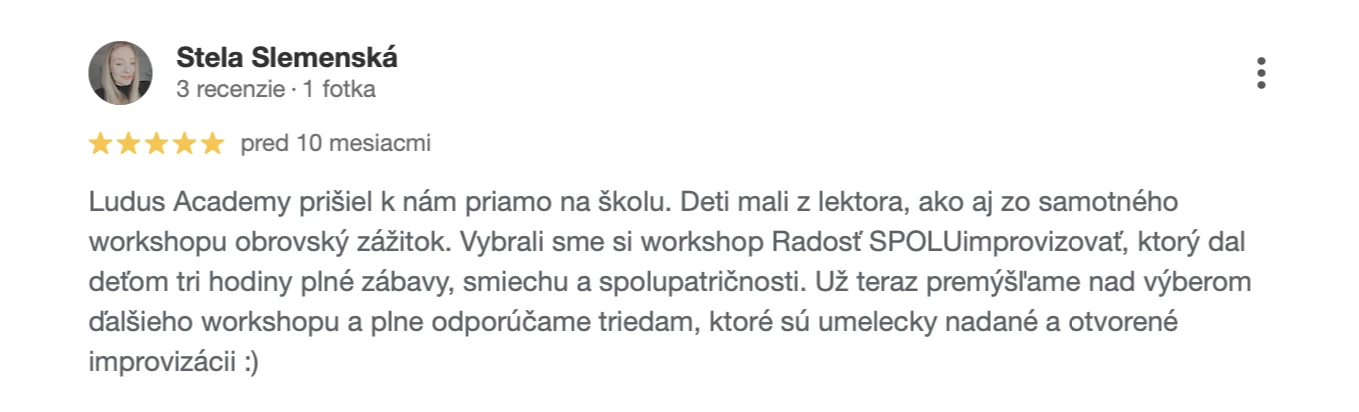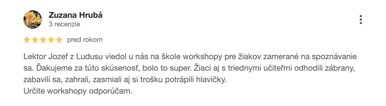 Zároveň môžete spolu s vašou triedou zistiť ako funguje kreatívne a improvizačné myslenie. Všetky workshopy sú postavené na učení prostredníctvom hry a vychádzajú z metód tvorivej dramatiky. Práve s týmito metódami máme viac ako 50 ročnú skúsenosť v škole LUDUS. Vy máte možnosť vybrať si, aký typ workshopu vám vyhovuje a čo práve vaša trieda potrebuje.